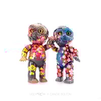7" tall soft vinyl one-off Sakura Ugly Babies. Both pieces were airbrushed with vinyl paint using sticker masking and feature one hand painted eye.